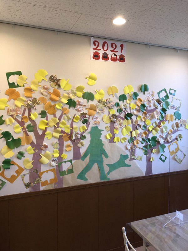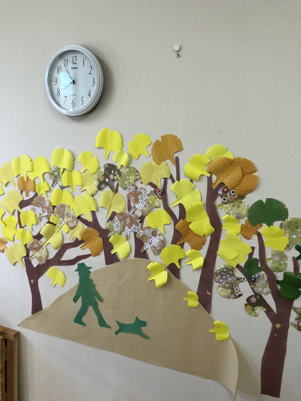 11月の壁飾りができました。今回のテーマは【イチョウ並木】です。
