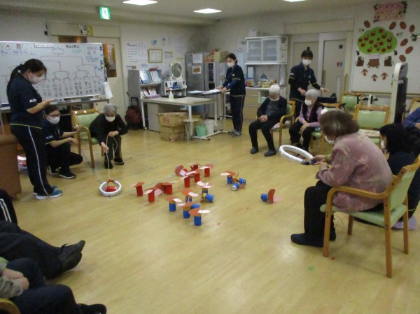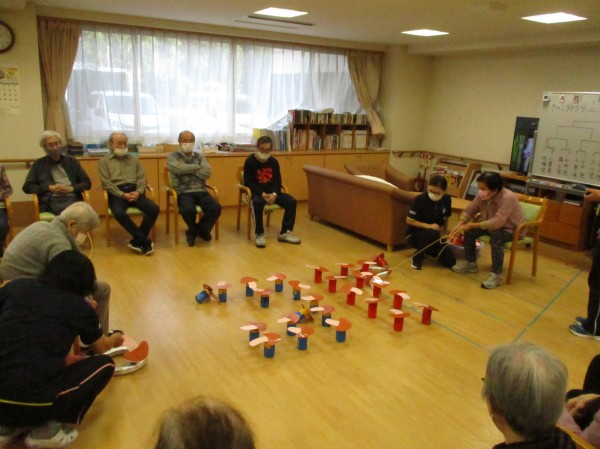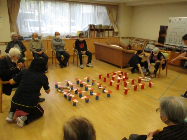 こんにちは!デイサービスセンター遊 西東京です!本日の運動レクレーションは『きのこ狩り』です!紐の付いた輪っかを