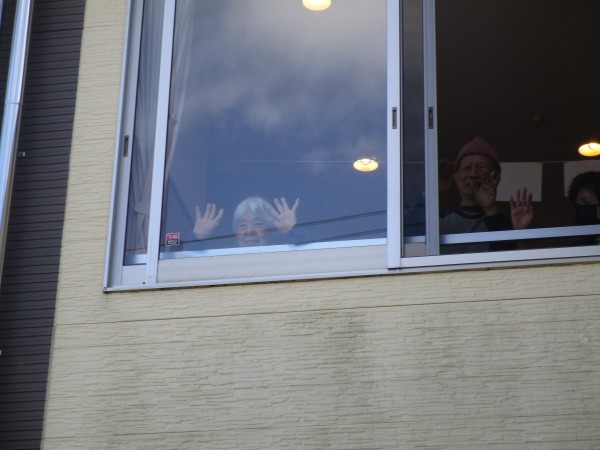 入居者様は窓の所に集まり、数人は玄関前に出て5m以上距離をとって歌を聴いていました。感激して泣いている方もいらっしゃいましたよ(;∀; )