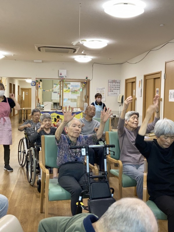 自分のホーム以外のみなさんの様子が見え、みんなで一緒に楽しく体操をしますので、これも社会参加の一つになります。