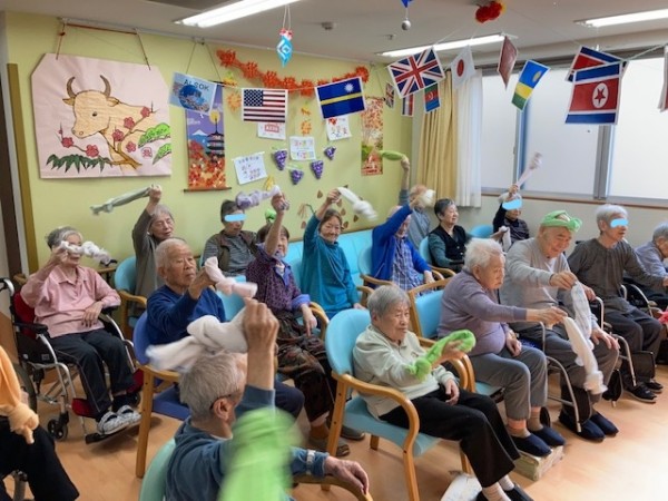 グループホームみんなの家・墨田でタオルを使った「AK体操」を楽しむ