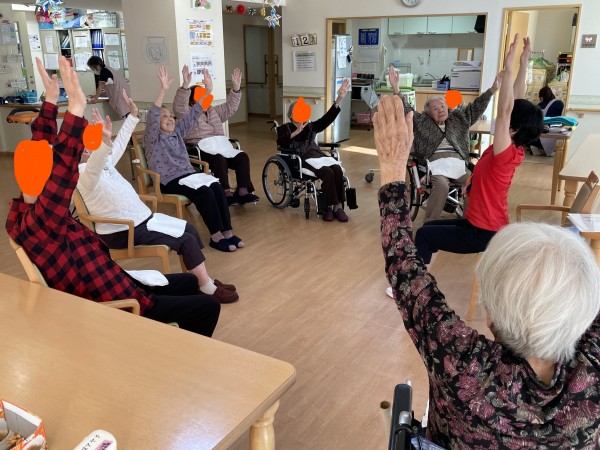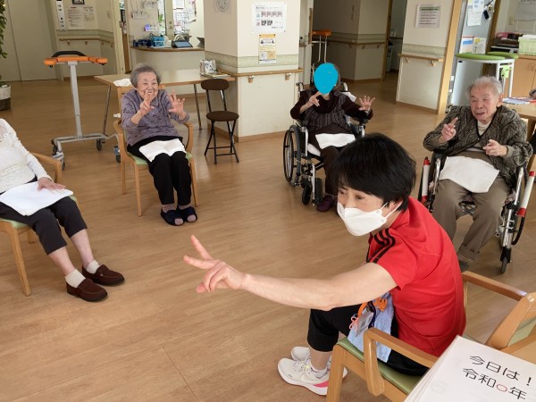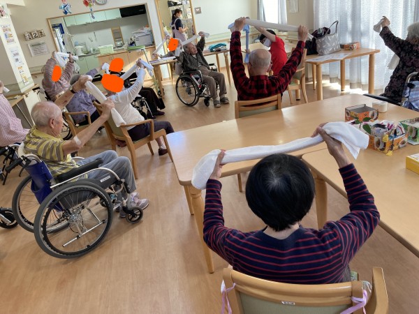 皆さん、タオルを持って、手を上げたり、足を上げたりと