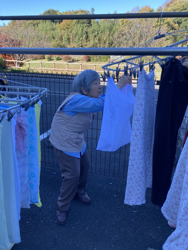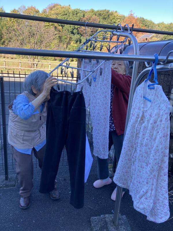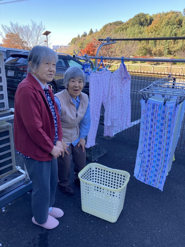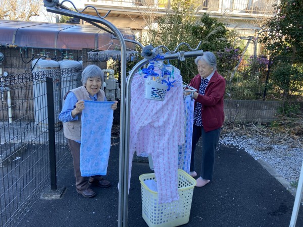 こんにちは!グループホームみんなの家・横浜宮沢2です♪ 朝から洗濯物を干すのを手伝って下さいました。 スタッフが「寒いけど大丈夫ですか?」と聞くと 「大丈夫大丈夫!寒くないわよ。」と、頼もしいお返事(^_^) お二人でお話しながら外の物干し竿に全部干して下さいました。 寒い中ありがとうございました!