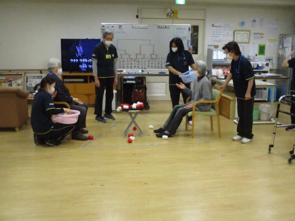 こんにちは!デイサービスセンター遊 西東京です。今日の運動レクレーションは『お手玉ツムツム』です。