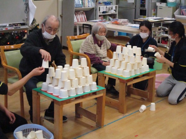 50個のカップを2分間で所定の台の上にいくつ並べる事が出来るかを競争します。今回は力よりもテクニックが