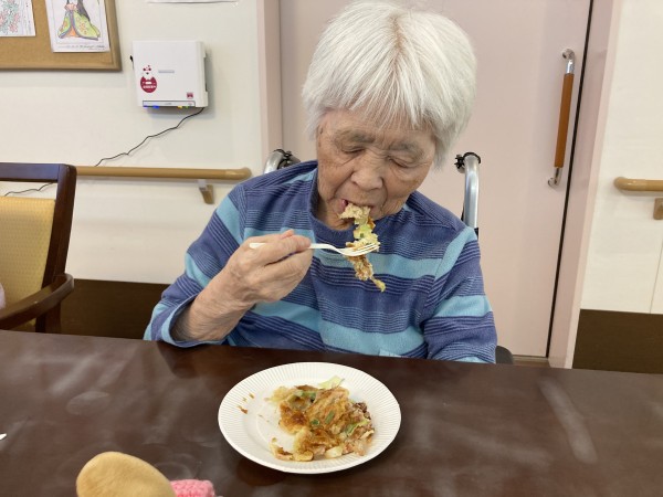 お好み焼きを食べる様子です。ぃぃ笑顔です。