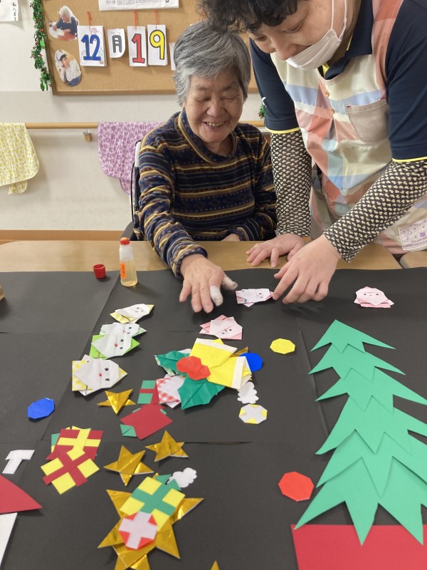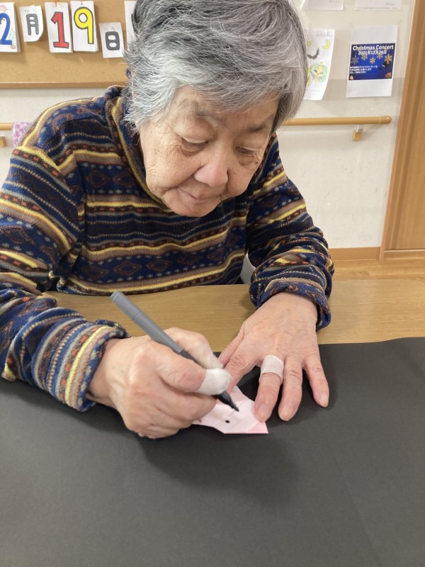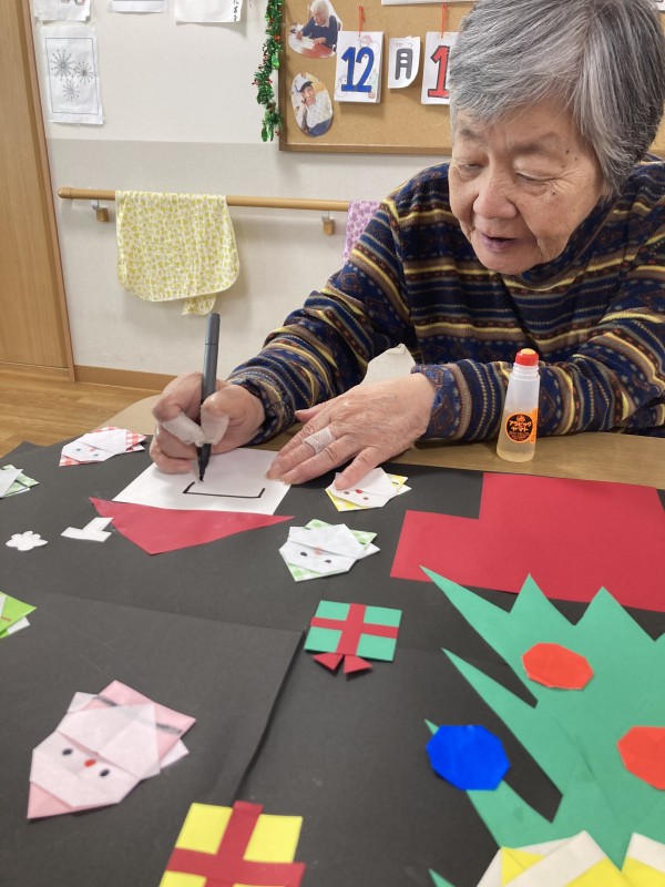 職員さんに「サンタ可愛く描けたね!」と話すとよい笑顔をいただきました。