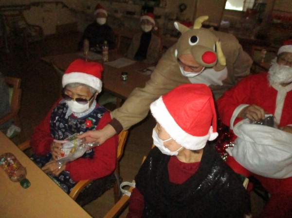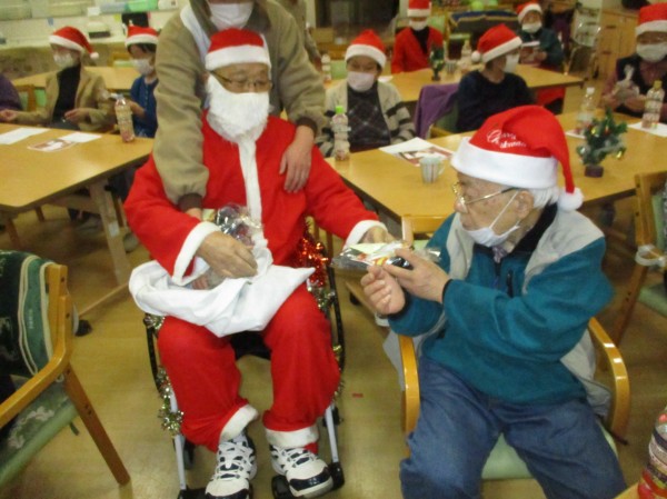 (ご利用者様が扮して)登場しプレゼントを皆様にお配りしました。その後、皆様おやつや飲み物で賑やかにすごされました。