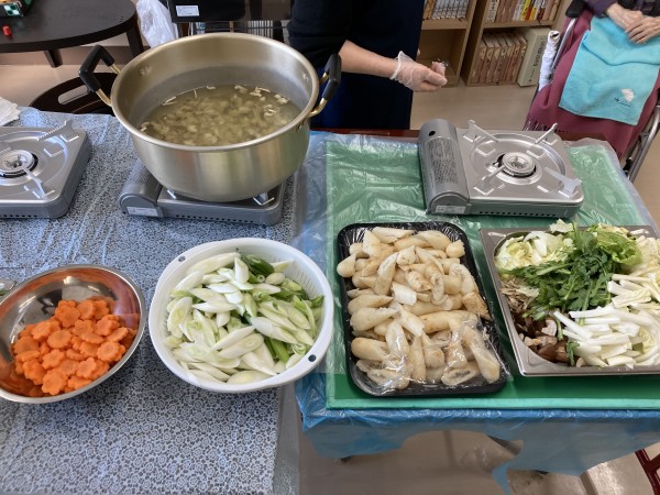 「私はこれでも昔は主婦をしていたのよ♪」等楽しい話をしならが、きりたんぽ鍋の作成を行いました。具材を切ったり火を扱ったりする等の基本的な調理は職員が行いますが、可能な範囲で皆様にお手伝い頂きました。またお手伝いをなさらないご利用者様にも安全な距離を保ちながら調理するところを見届けて頂きました。