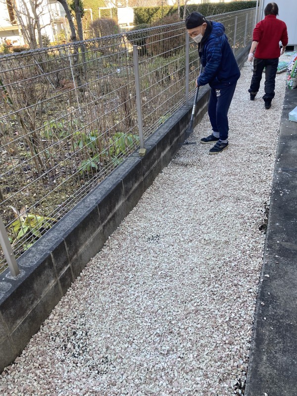 今回は我々スタッフが行う環境整備で裏庭に軽石を敷き詰めました!