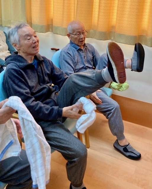 墨田のご利用者様は、タオルを使った体操があっているようで、写真のように手足がとても動きます。
