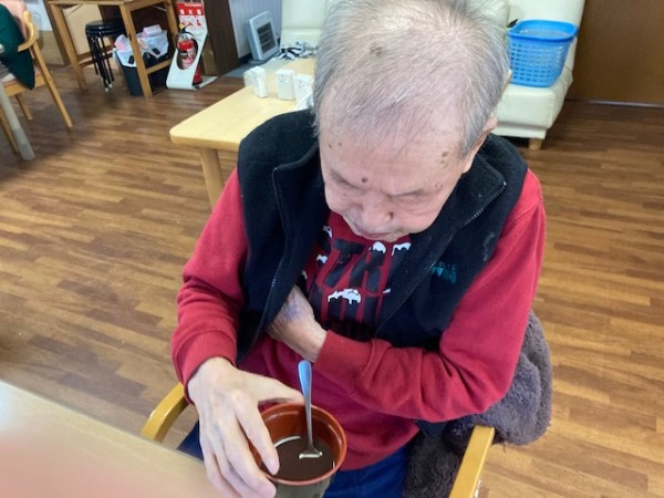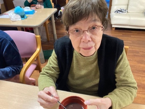 前回のブログの続きでかるた大会が終わりましたので、おやつにおしるこを召し上がっていただきました。あまりにも熱中したかるた大会だったので甘いおしるこで一息しました。