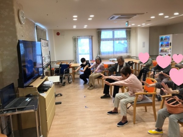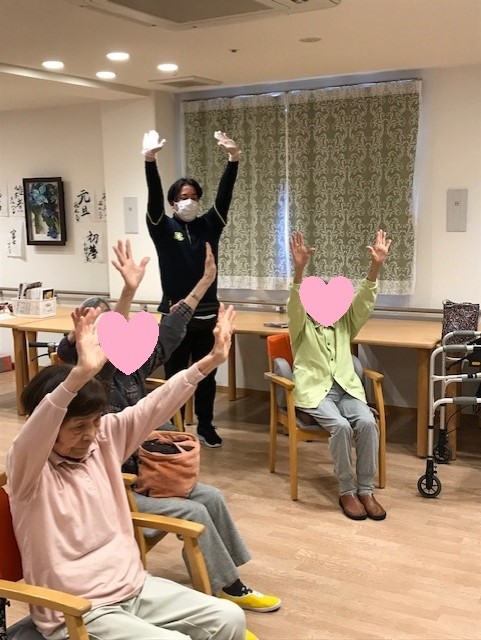 ご利用者様には、音楽のリズムに合わせ、大きな声も出して、体操して頂きました(^▽^)/
