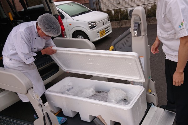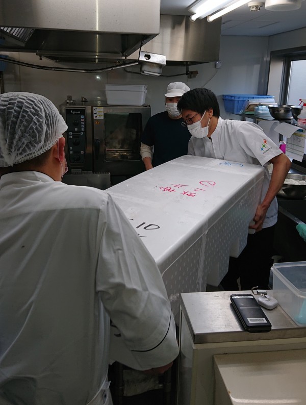 厨房業者のHITOWAフードサービスの職人の皆様が早速、受け取って下処理開始!