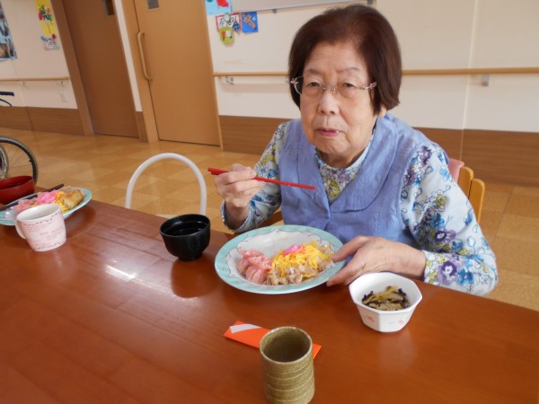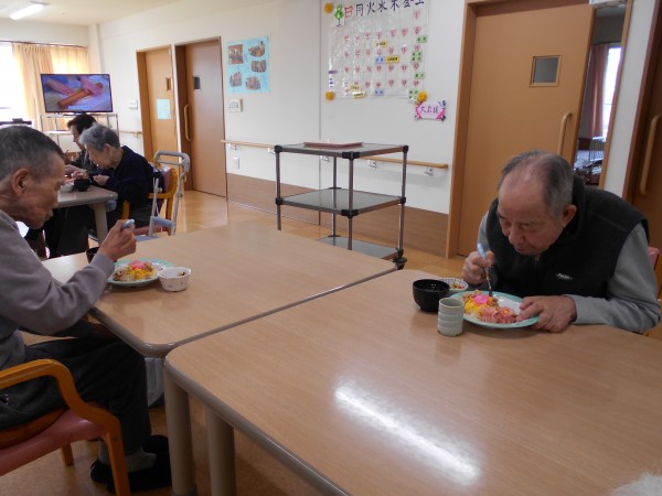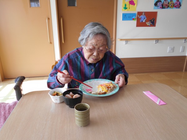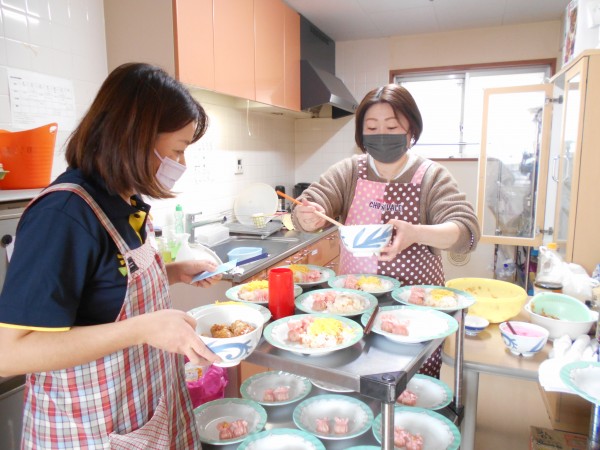 スタッフ手作りのちらし寿司、可愛い焼売と肉巻きを各フロアで召し上がりました。