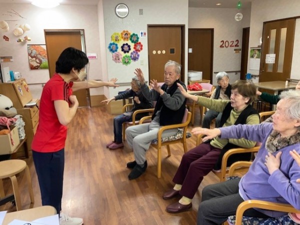 話は変わりまして、今週の24日月曜日に訪問運動教室の岡庭先生が目黒に来てくださいました。いつもはDVD上またはリモート越しで拝見していますが今回はちょうどタイミング良く訪問してくださり、いきいきリズム体操を一緒にしました。「まるで夢を見てる感じ」と言いつつ、とても楽しくご利用者様が参加されていました。