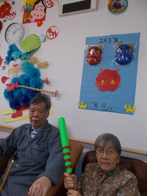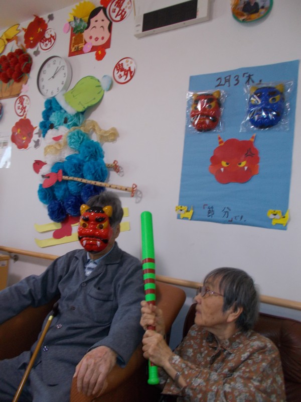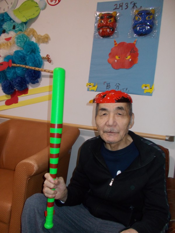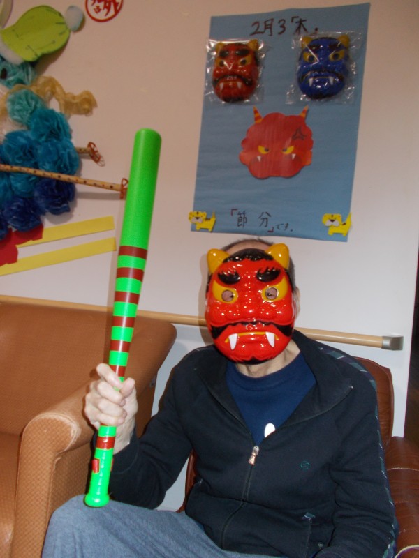 皆さんと毎年恒例の豆まきをしました。(豆は痛いので新聞紙を丸めたものを投げます)(笑) 節分ということで、男性入居者様が鬼になっていただけるとの申し出があり