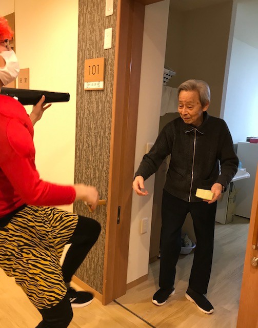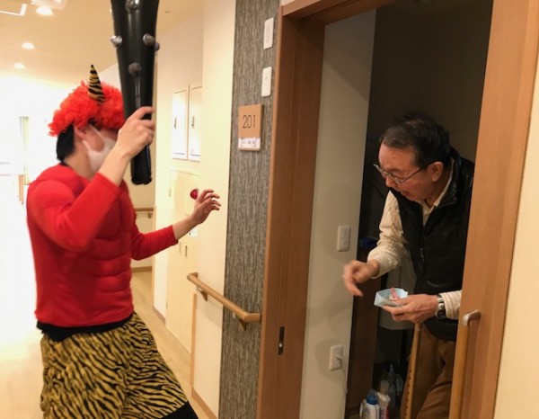 今回は、お客様に集まってもらわずにお客様一人一人のお部屋へお邪魔し、用意した甘納豆で豆まきをしてもらいました。