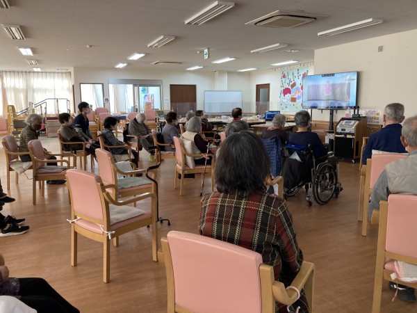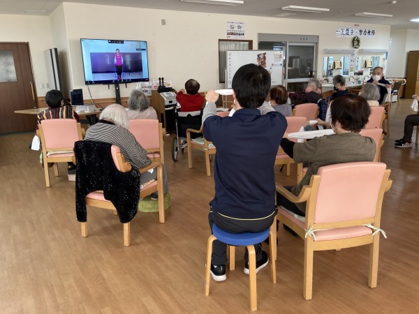 テレビ画面でリモートにて、体操を実施いたしました。タオルを使って、全身を使ったトレーニングを行い、利用者様も「疲れた」と