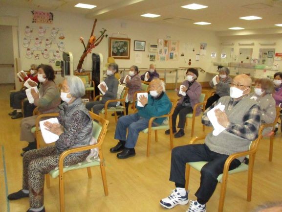 今日の運動レクレーションは『zoomタオル体操です!』皆さん一生懸命タオルを動かす中で自然と体操されていました。