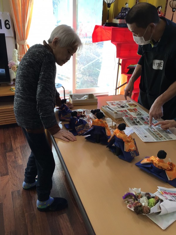 H様、F様の監督のもと、はじめてお雛様を飾る男性スタッフが四苦八苦しながら1時間ほどで完成しました。