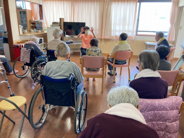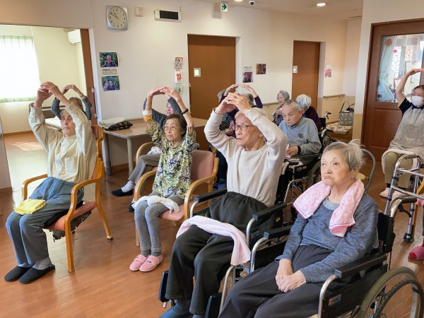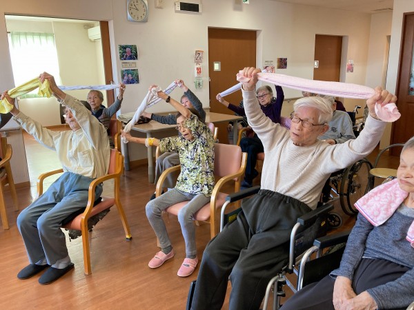 1階、2階の利用者様が集まり、ノーアエクササイズとタオル体操を行いました♪