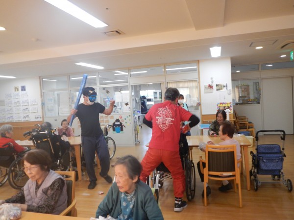 鬼に扮した職員が登場するや否や、「ぽか~ん」とした表情をされるご利用者様が多い中、やや遠めにいた男性ご利用者様が「鬼は~外!」と第一投を投げられると、次から次へと豆に見立てた新聞を丸めた玉が、鬼めがけて飛んで来ました。