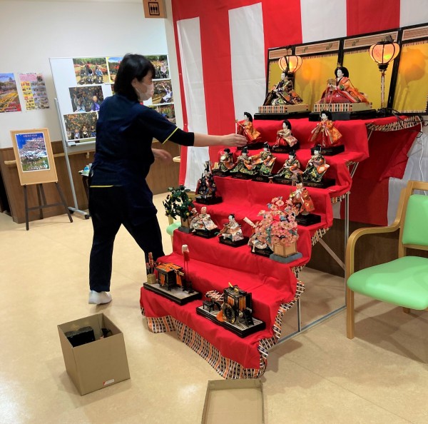 2月初めに皆でお雛様を各階に飾りました。