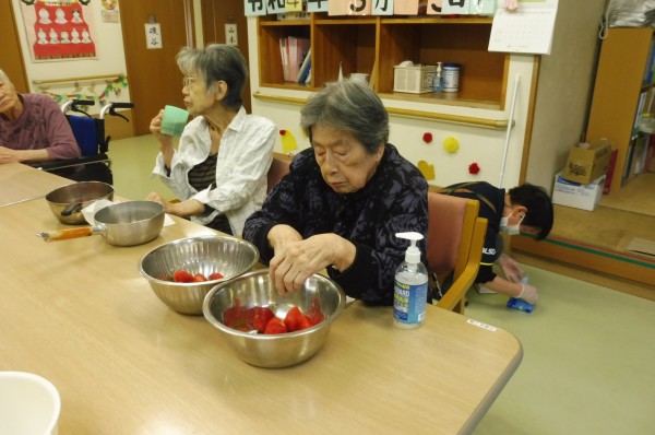 おやつで使用する「いちご」のへたとり。