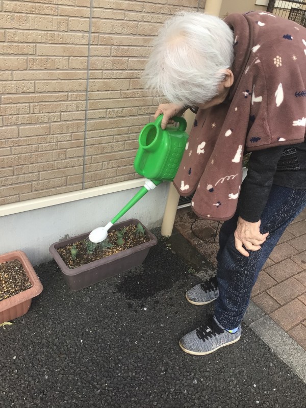外気浴に出ると、日向ぼっこの合間に花にお水をあげます。