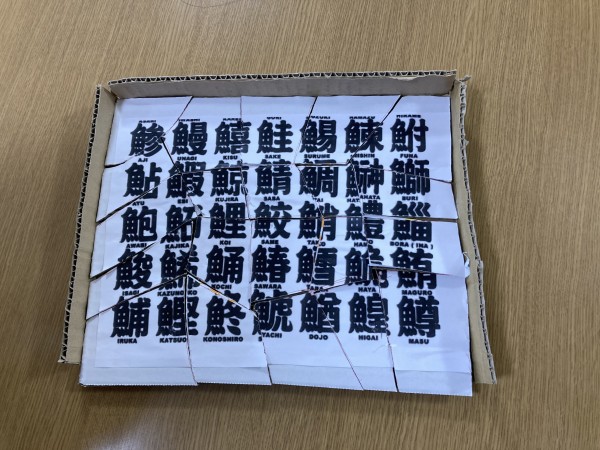 こちらが、スタッフ自作のジグソーパズル。題して「魚漢字ジグゾーパズル」!まだ試作品の為、ところどころ切り口が汚いですがこれから改善していく予定です(汗
