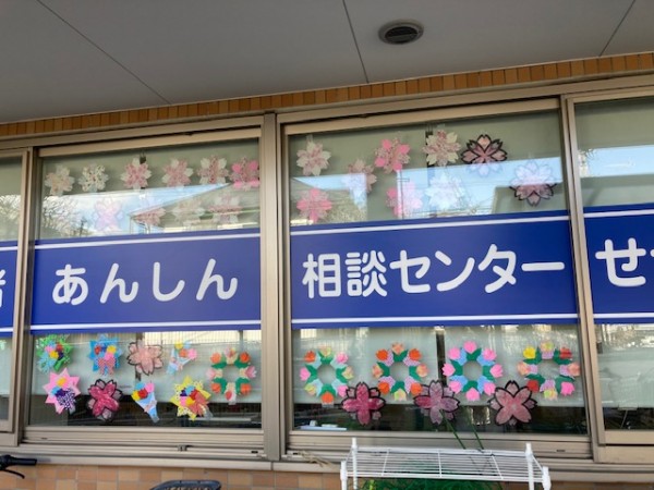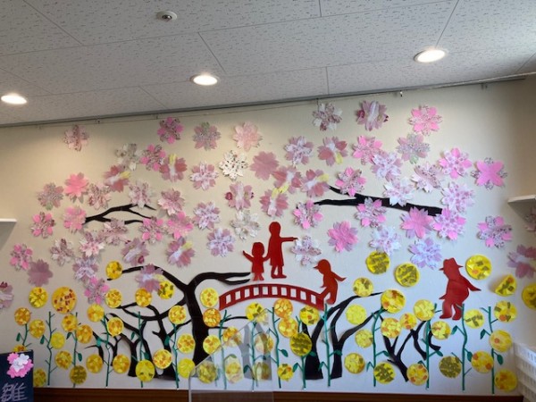せせらぎ玄関の壁面には、満開の桜が咲きました。