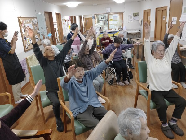 この体操イベントのもうひとつの特長は、①当ホームの1Fと2Fのみなさんが合同で参加されること、に加え、②リモートでALSOK介護の他の施設のみなさんと一緒にお互いの様子を感じながら体操できること、すなわち社会参加にあります。