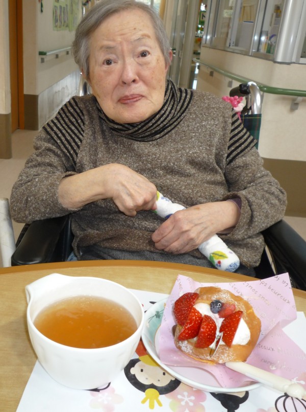 苺のケーキを美味しそうに
