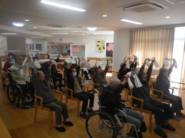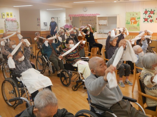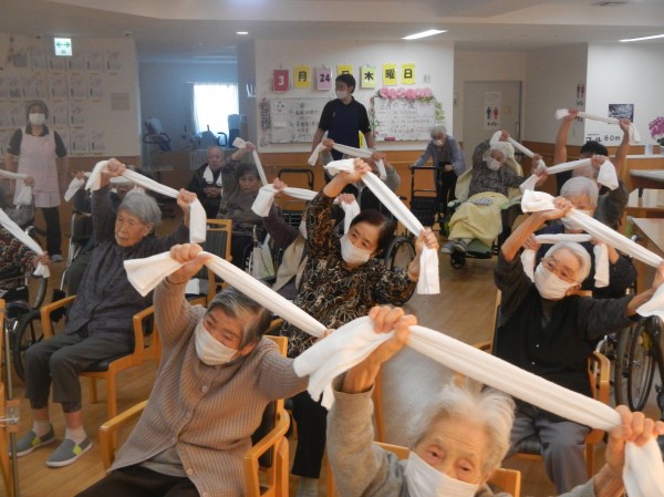 時には頭上に投げたり、足の下をくぐらせたりと、タオルを縦横無尽に使い切り、健康のための体作りに取り組まれています。