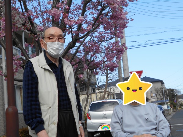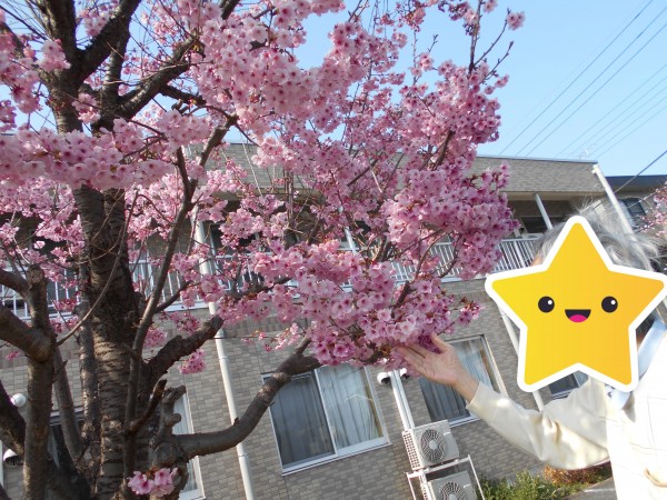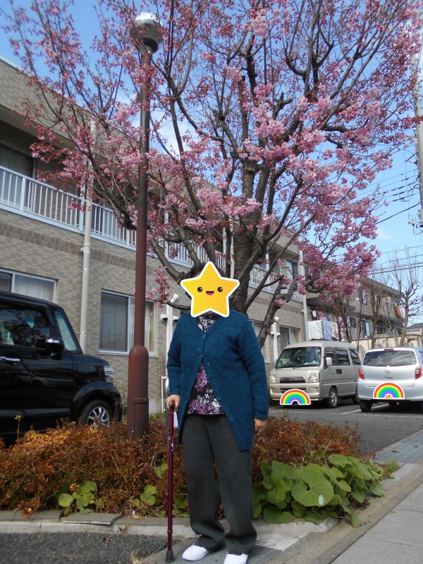 こんにちわ、ショートステイみんなの家・大宮吉野町です。以前にお伝えしました当施設・入口そばの寒桜ですが、2~3日前に満開となり、この見事な桜の花を見て頂きたいと思いまして、今回ご利用者様にお声がけをして、ささやかながら花見を楽しんで頂きました。