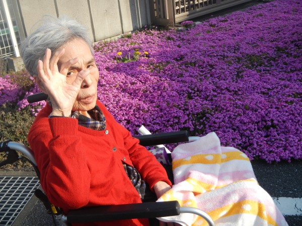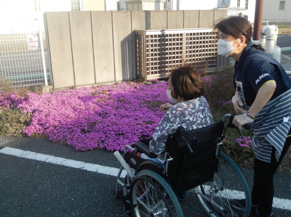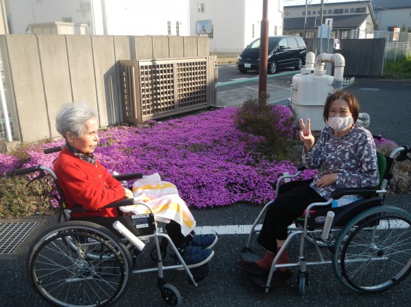 この日も、外気浴に出たご利用者様が、芝桜の前で記念撮影。