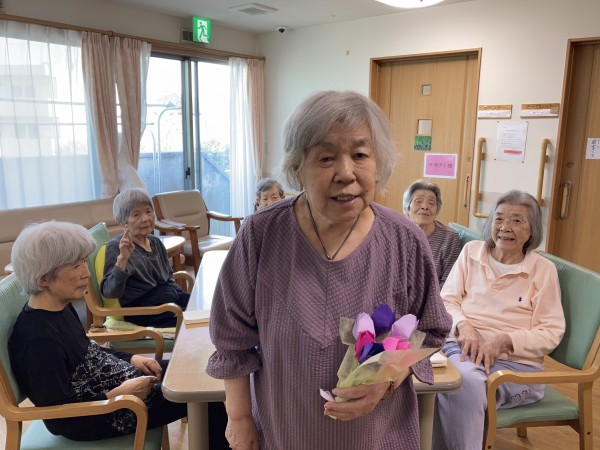 でも、他の入居者様とスタッフでバースデーソングを歌いだすと、笑顔で応えてくださり、