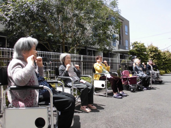 プランターの花を見ながらの体操は、