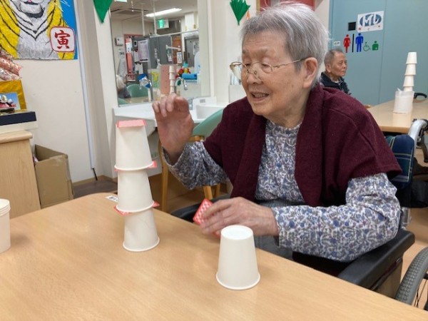 グループホームみんなの家・墨田で紙コップを使い何段詰めるか挑戦しました。