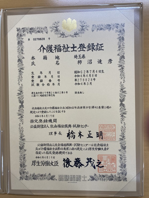 登録証が届いた事により、正式に「介護福祉士」を名乗れるようになりました。
