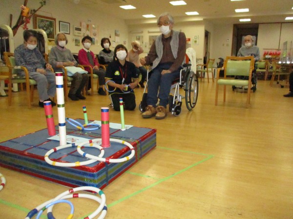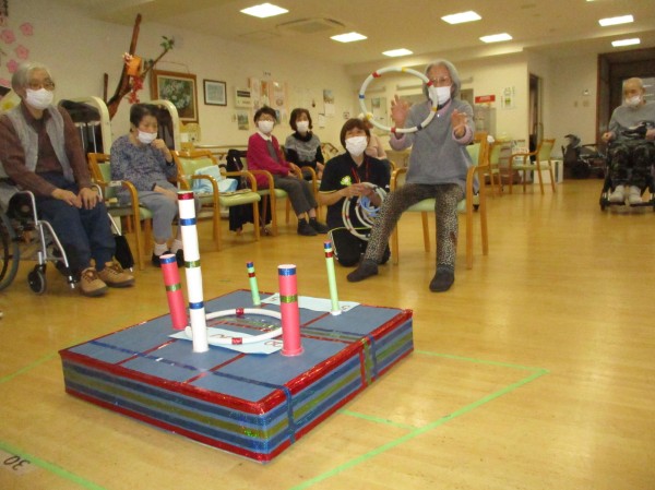 こんにちは!デイサービスセンター遊・西東京です!今回の運動レクリエーションは『輪投げ』です。板の上に歪にでている高点数の棒に輪っかを入れ、