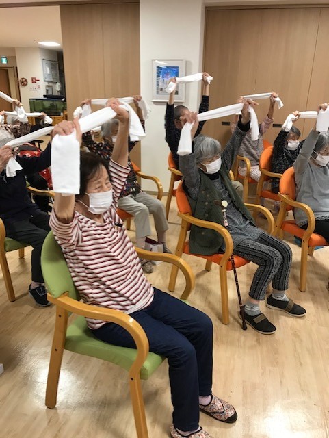 タオルを使って全身の体操をしていました。(^^)/~~~