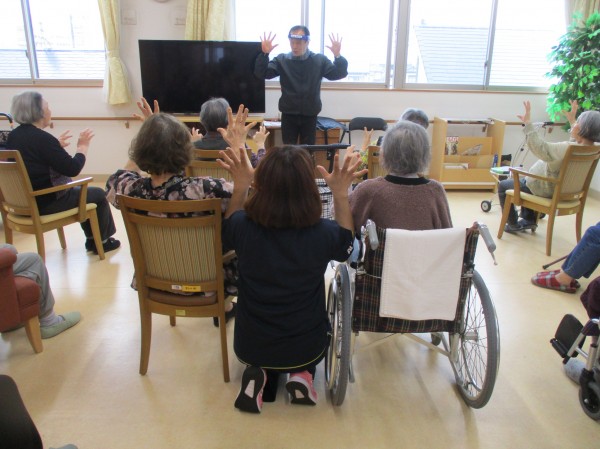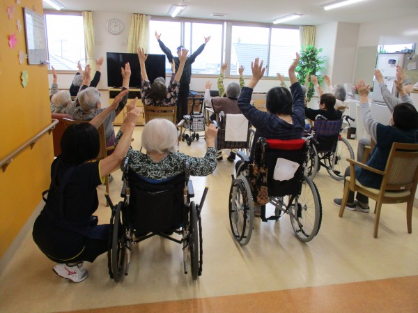 ご利用者の皆様は、それぞれできる範囲で手を上げたり、足を上げたり...