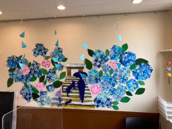 あじさいは、折り紙に絵の具を重ねて色付けされており、手が込んだ仕上がりとなっております。