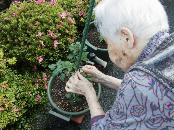 トマトの成長具合をみて、「ここ紐で結んであげた方がいいわ」と…