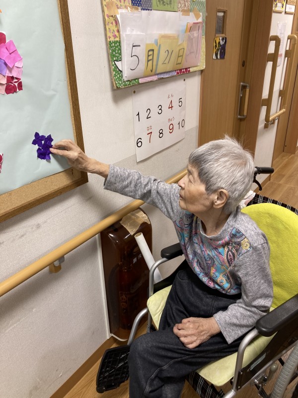 今日はスタッフと一緒に折紙でアジサイを作っています。