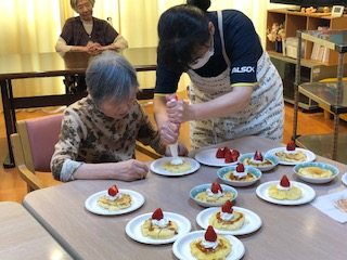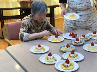 さらにご入居者様にイチゴで飾りつけてもらいます^^