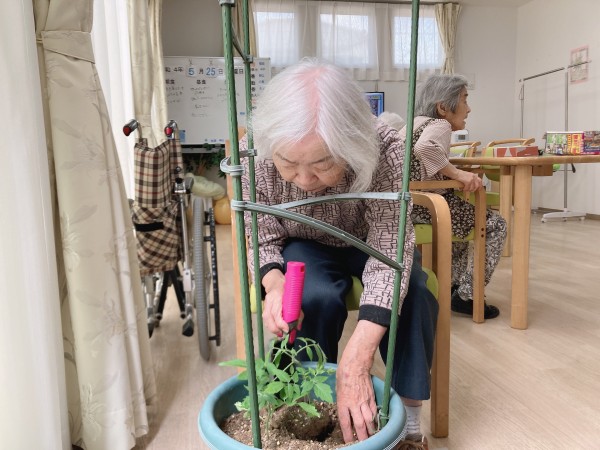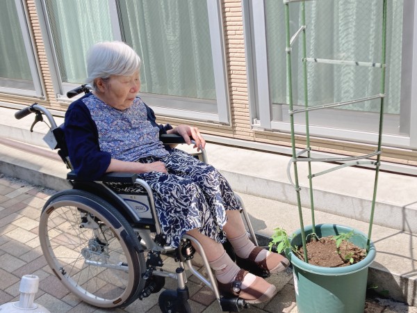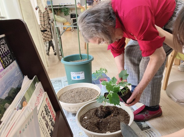 ご入居者様と一緒に、きゅうりとトマトの苗を植えました!