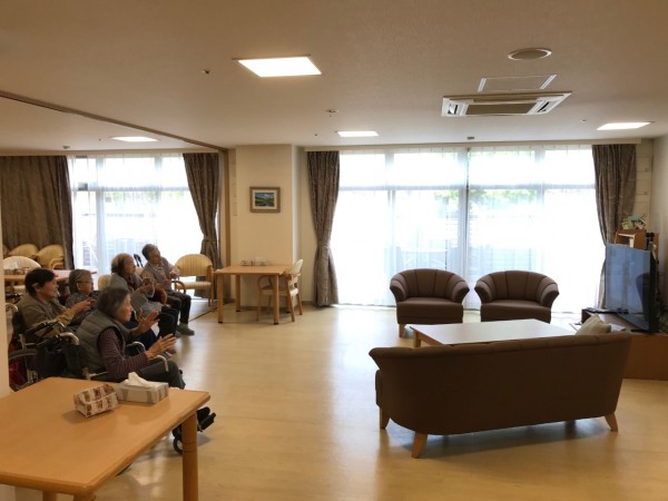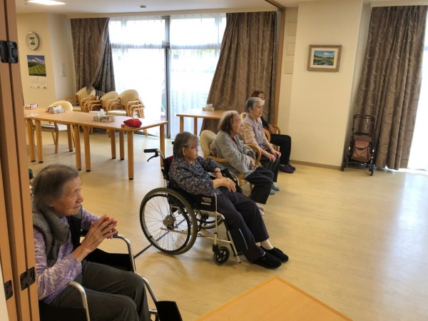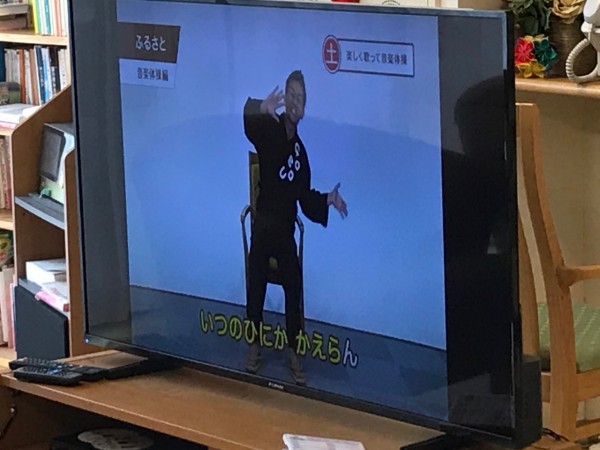 一階の皆様が体操をしながら「ふるさとの合唱」をしております。